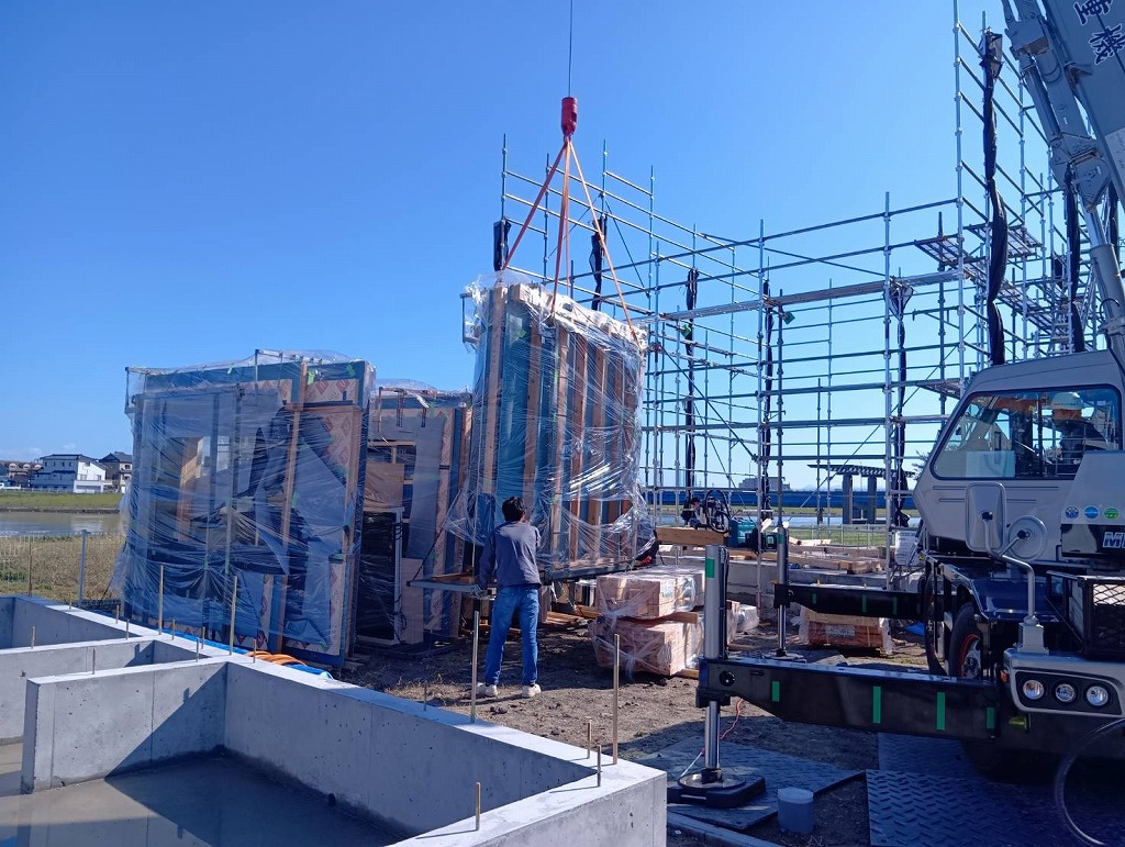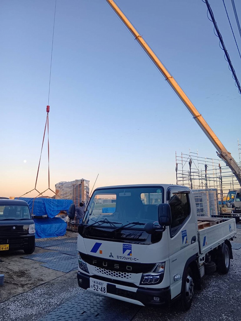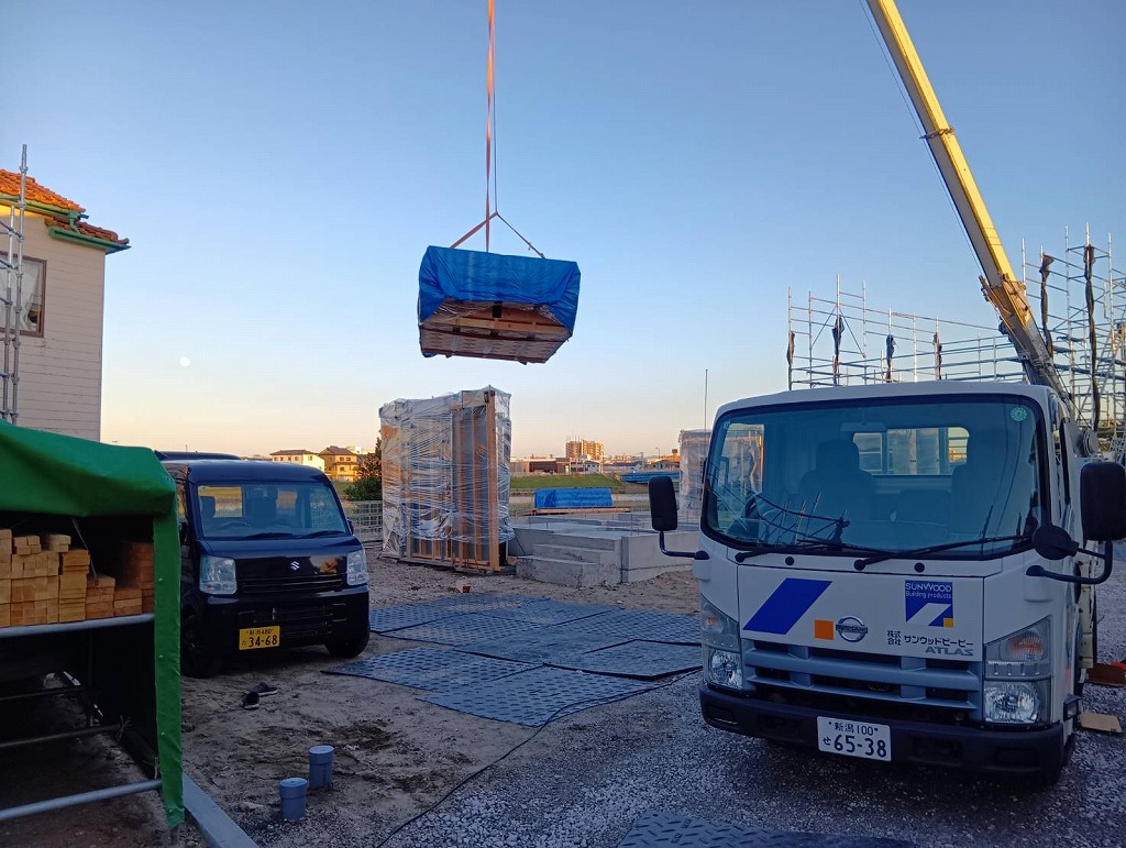 本日、新潟市西区のM様邸、木造大型パネルの搬入を行っています。