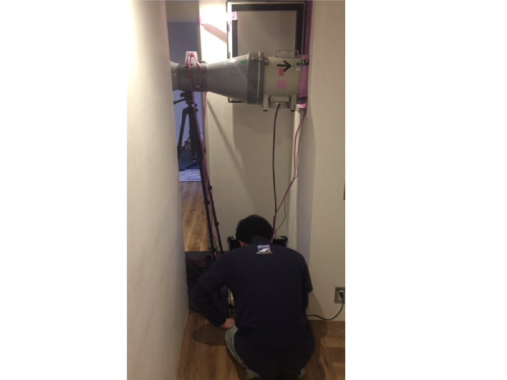 室内の空気を測定器のファンで強制的に外に吐き出し、この時に生じる室内と室外の気圧差と風量を測定することにより、その住宅の隙間を自動で算出します。